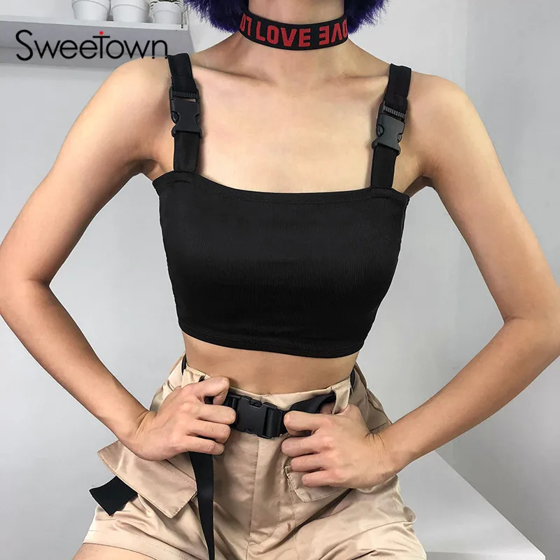 Sweetown Растениеводство Топ Bralette Для женщин пикантные черные сапоги майка Клубная одежда лето с Пластик Пряжка укороченные Feminino Корейская фут...