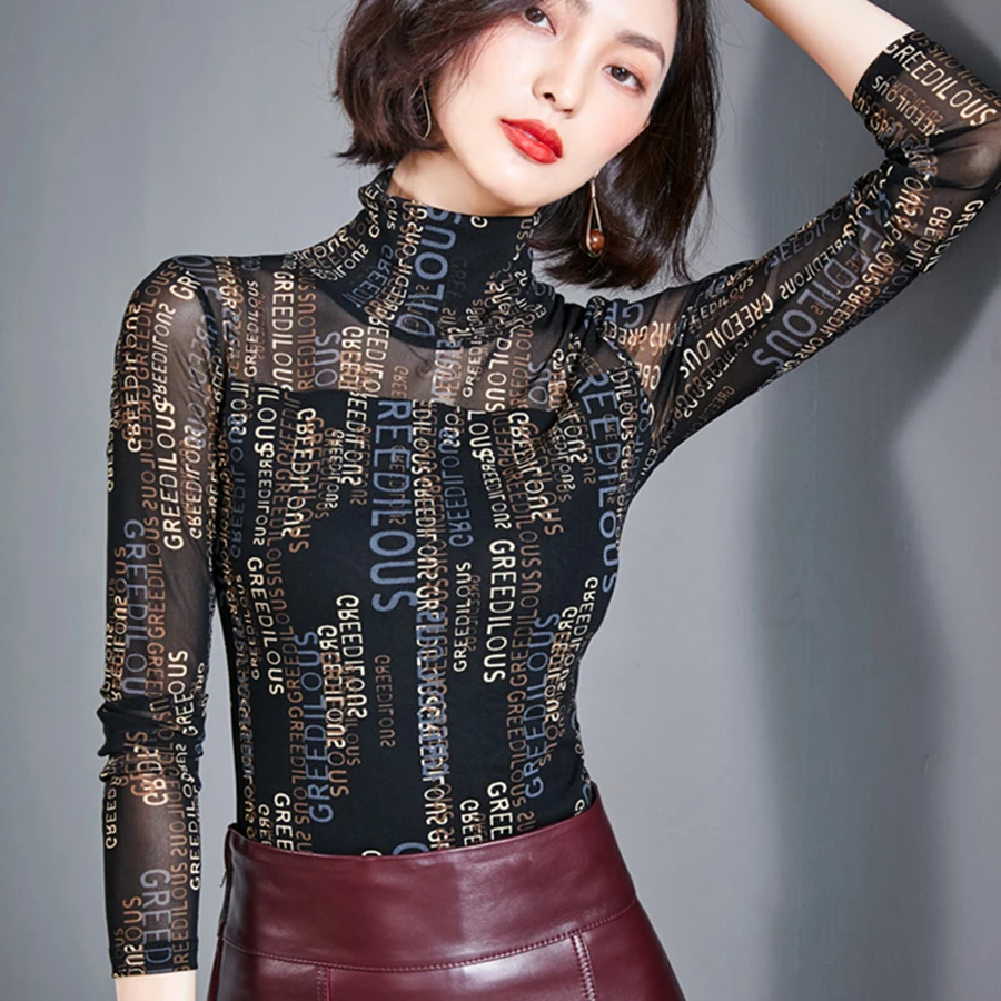 Новая водолазка с буквенным принтом, тонкая Сетчатая футболка с длинным рукавом, женские рубашки размера плюс, модная женская одежда 2019