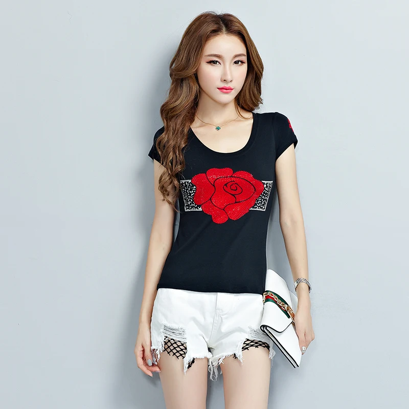 Женские летние футболки 2019 года с принтом бриллиантов и роз, футболки с короткими рукавами и круглым вырезом, хлопковые повседневные тонкие...