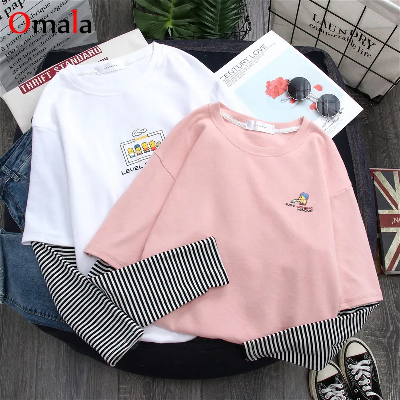 2020 Весенняя футболка с длинным рукавом в стиле Харадзюку, женская уличная одежда в стиле хип-хоп, корейские полосатые футболки с мультяшным ...