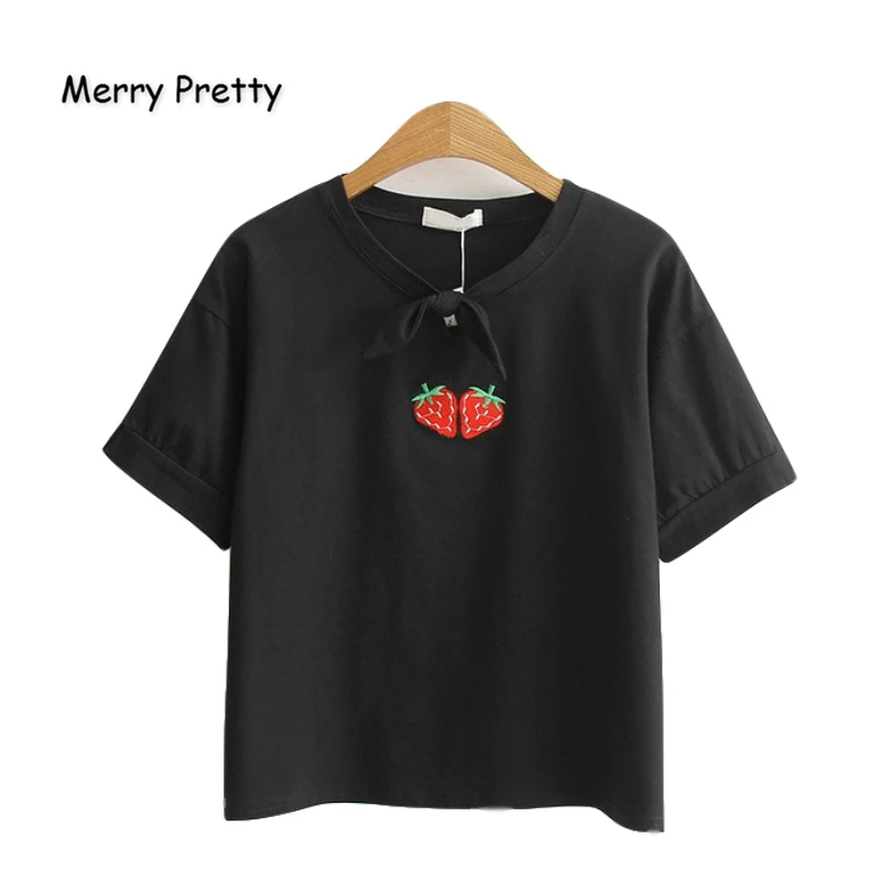 MERRY PRETTY/Хлопковые женские футболки Харадзюку с вышитой клубничкой из мультфильма, летняя футболка с коротким рукавом и круглым вырезом, баз...