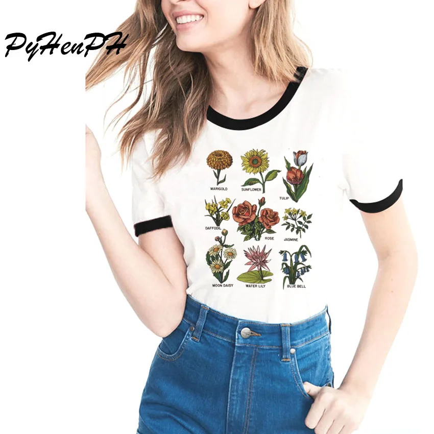 Новая брендовая модная футболка с изображением дикого цветка, Женская Винтажная футболка с коротким рукавом и круглым вырезом, свободная ф...