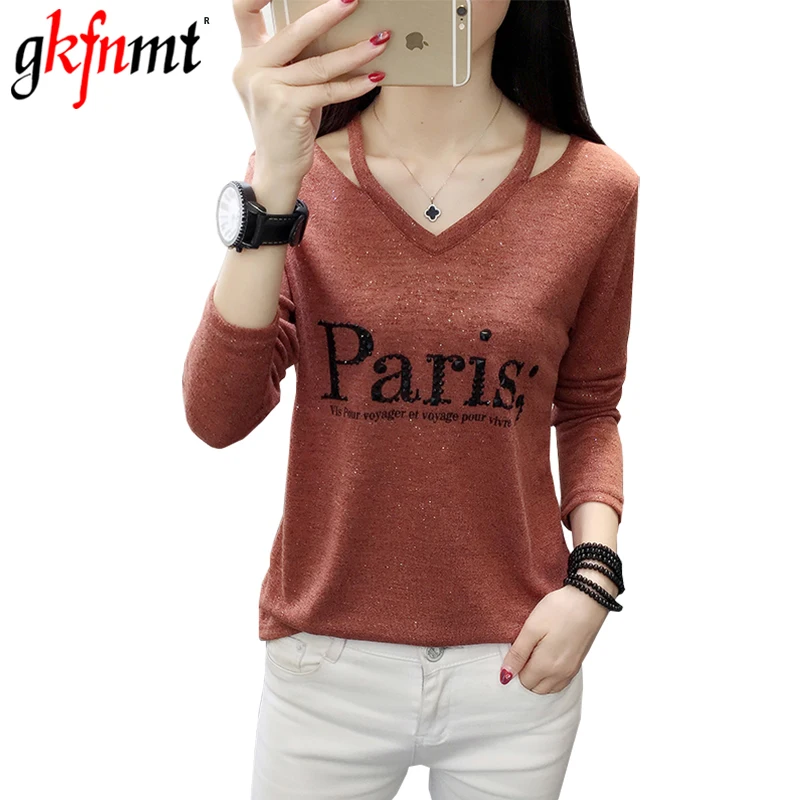 Мода v-образным вырезом Футболка Для женщин футболка 2018 корейский стиль буквы Diamonds Для женщин топы с длинным рукавом Тонкий Основные женска...