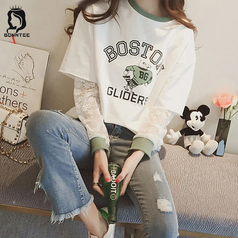 Плюс Размеры Для женщин футболка с длинными рукавами Для женщин s кружева мультфильм печатных женский Повседневное футболки свободные корейский стиль шик моды