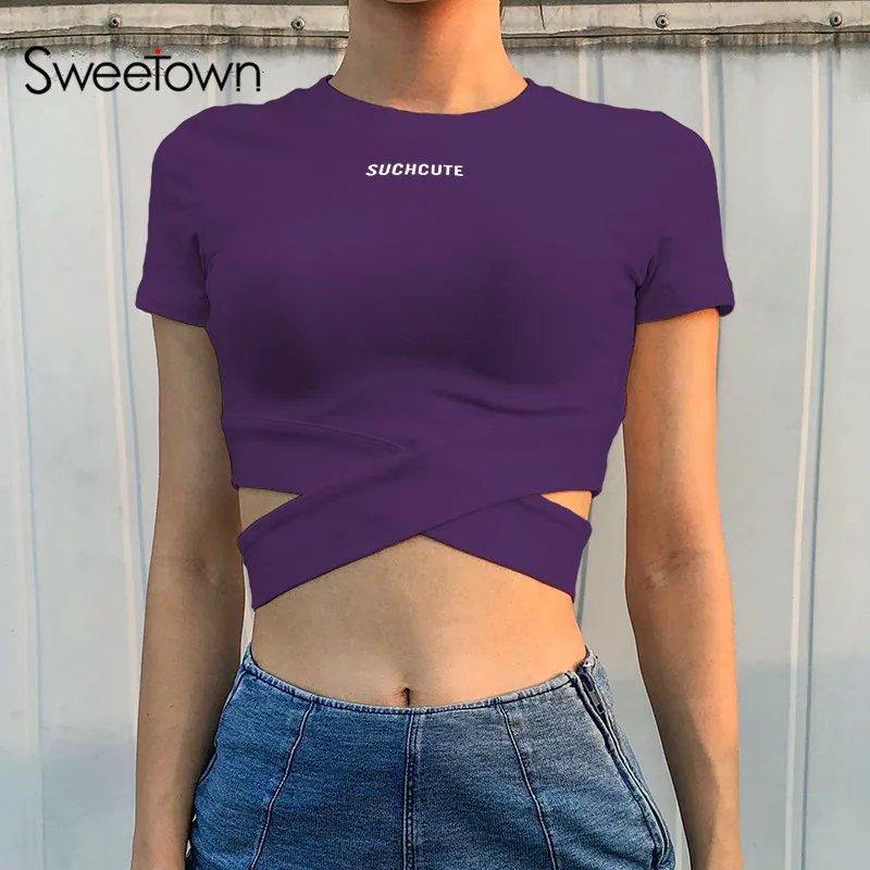 Sweetown Vogue белый укороченный Топ Футболка женская 2018 Лето Черная футболка Femme фиолетовый крест-накрест Выдалбливают Женская футболка Топы