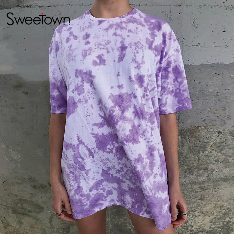 Женская длинная футболка Sweetown Tie Dye, уличная одежда в стиле хип-хоп с коротким рукавом, Повседневная Свободная летняя футболка большого размера