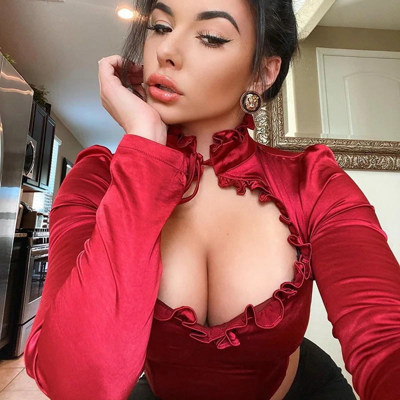 InstaHot атласная открытая Сексуальная футболка с оборками на шее с длинным рукавом, черный, красный, осенне-летний тонкий женский топ, Повседневная шелковая футболка для женщин