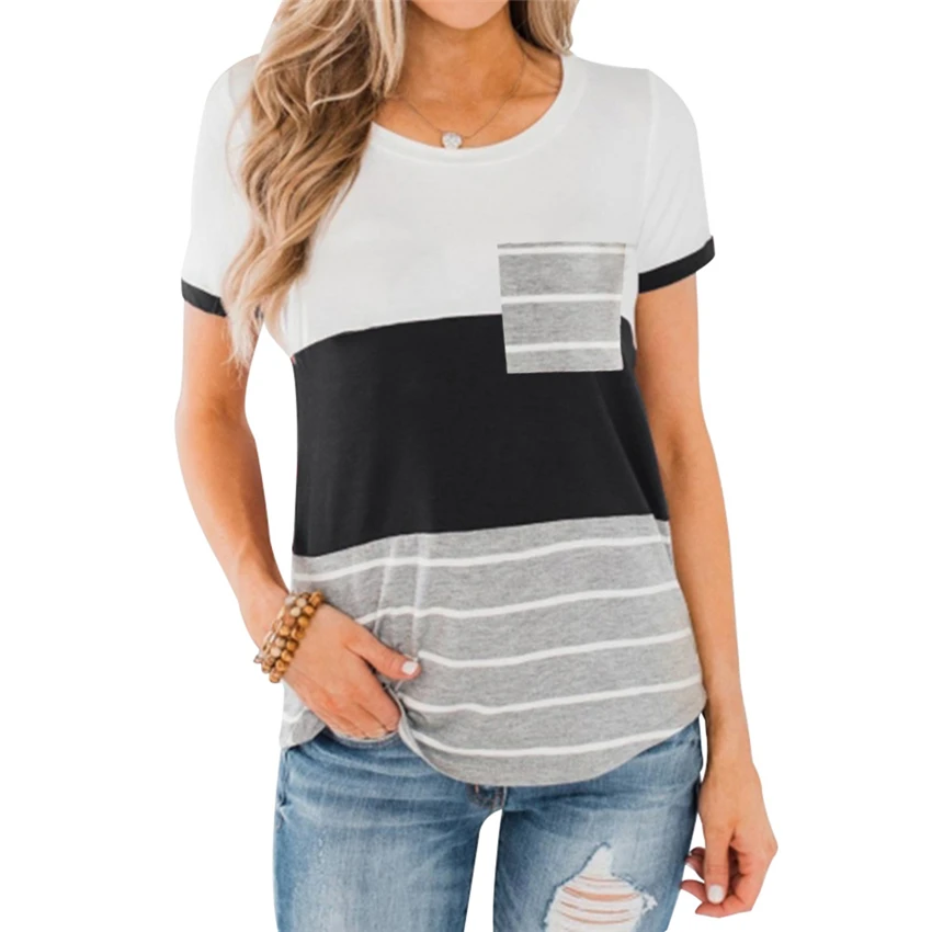 Женская футболка с карманом, топ в полоску Футболка, летняя футболка с коротким рукавом, новинка 2020, лоскутный облегающий Топ, женские футбо...