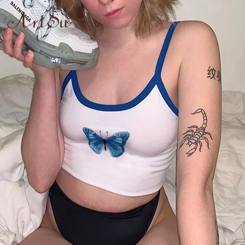 Artsu/Летняя одежда с принтом бабочки, майка без рукавов, топ, жилет, повседневный укороченный топ, футболки, женские милые топы на бретельках ASVE60862
