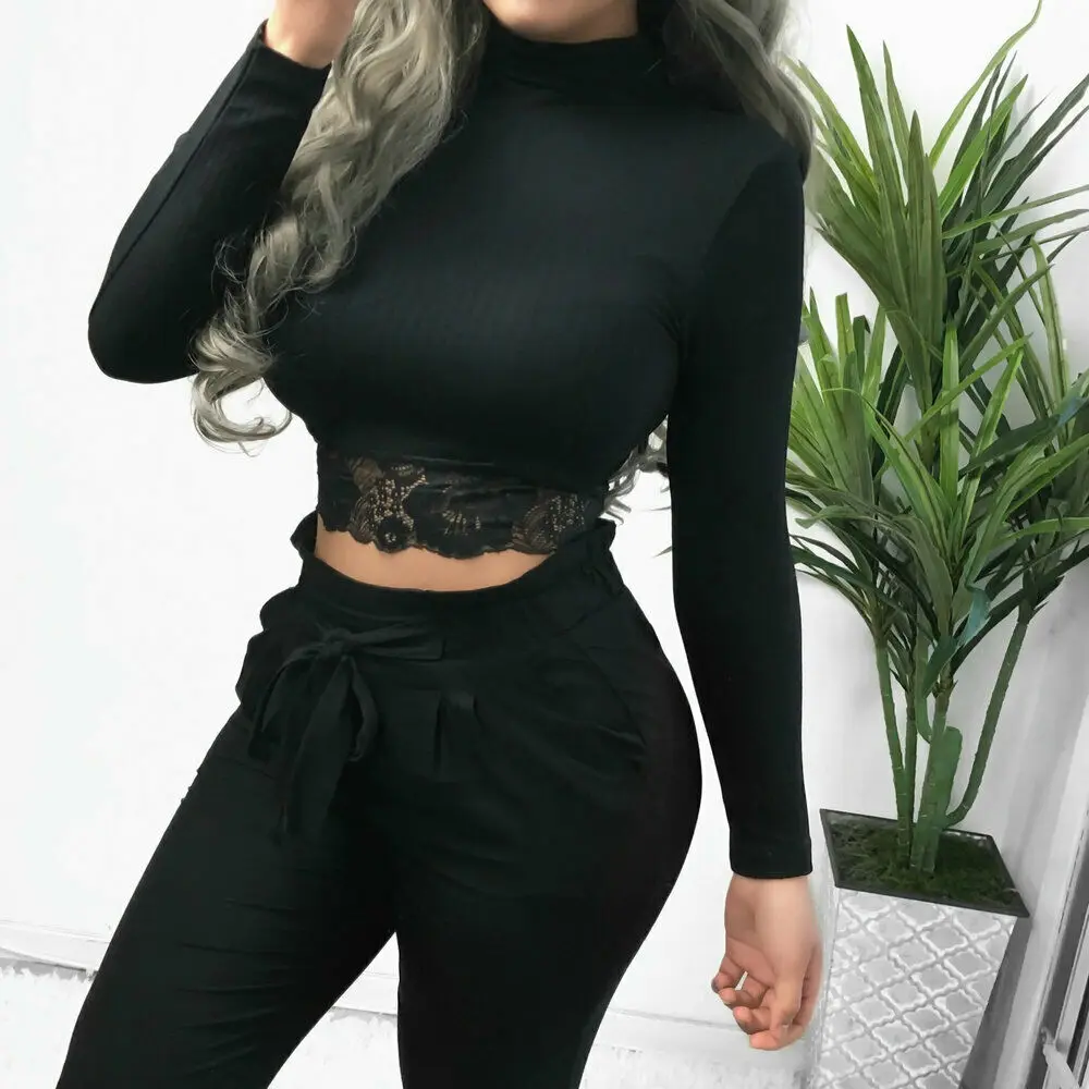Осенние женские сексуальные топы с высоким воротником, водолазка, кружевная Лоскутная футболка с длинным рукавом, вязаный облегающий Топ