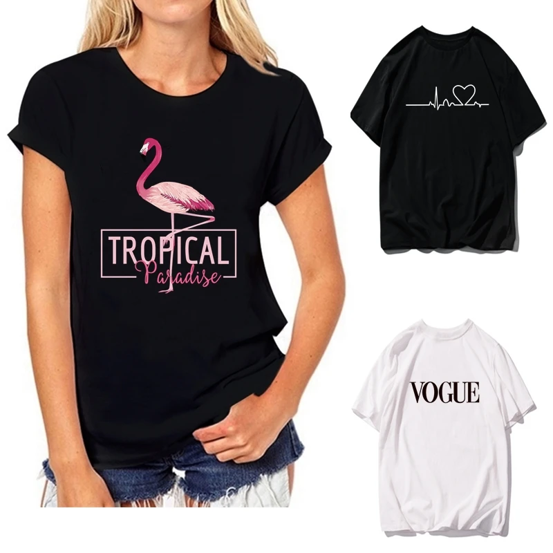 2019 новые летние футболки, женские футболки, топы для девочек, футболки, тонкие женские футболки с принтом фламинго, белые, черные футболки с ...