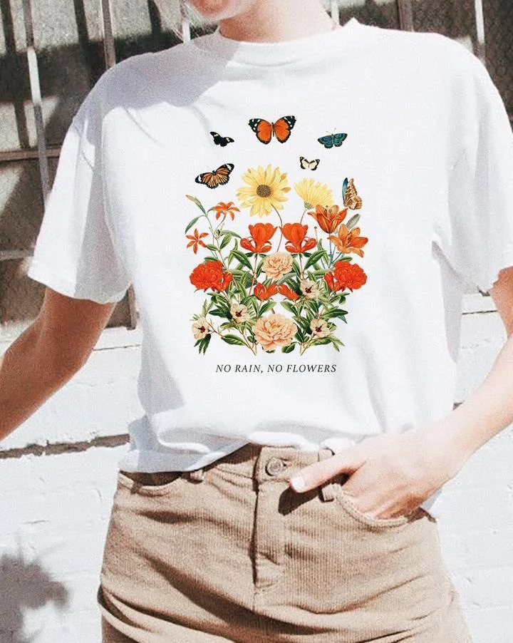 Никакой дождь не Футболка с цветами футболка с рисунком (цветы и бабочка Винтаж стиле рубашки с рисунками; летние модные топы