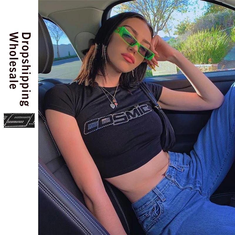 Черные хлопковые футболки с буквенным принтом, стразы, женская летняя укороченная уличная одежда с пупком, модная футболка, облегающая короткая футболка