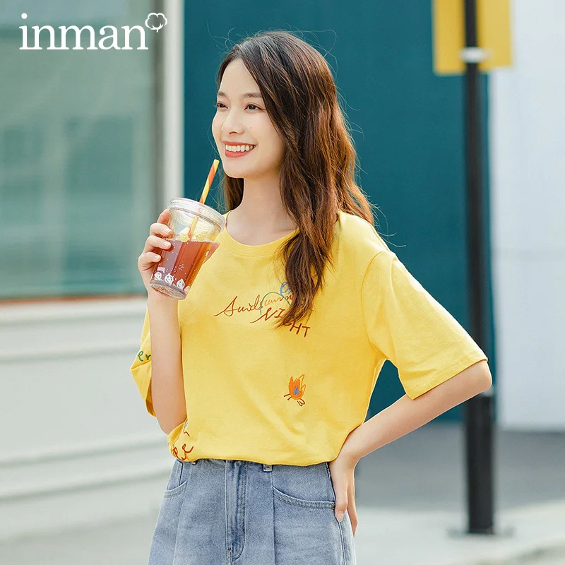Летняя футболка с принтом «Joker», комбинированная хлопковая Футболка с круглым воротником и вышивкой в виде куриных дорожек, inman