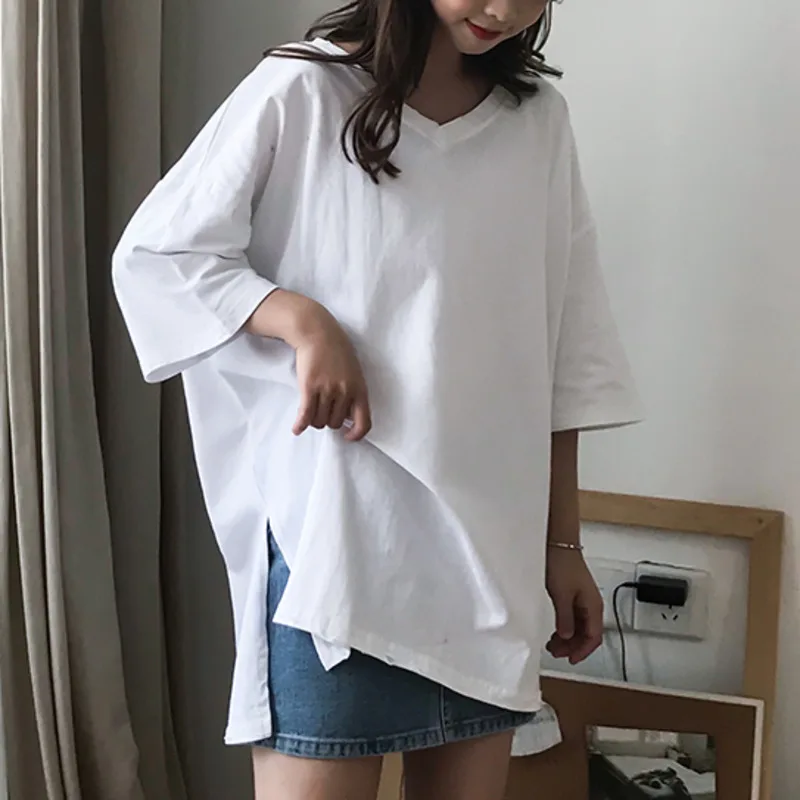 Женская футболка с v-образным вырезом, летняя повседневная свободная футболка с коротким рукавом, Однотонная футболка свободного кроя в стиле Харадзюку, уличный стиль