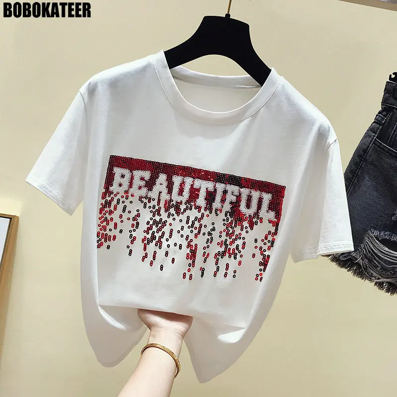 BOBOKATEER хлопковая белая футболка Для женщин топы Винтаж летний топ женский футболка с короткими рукавами с блестками черная футболка Femme Новы...