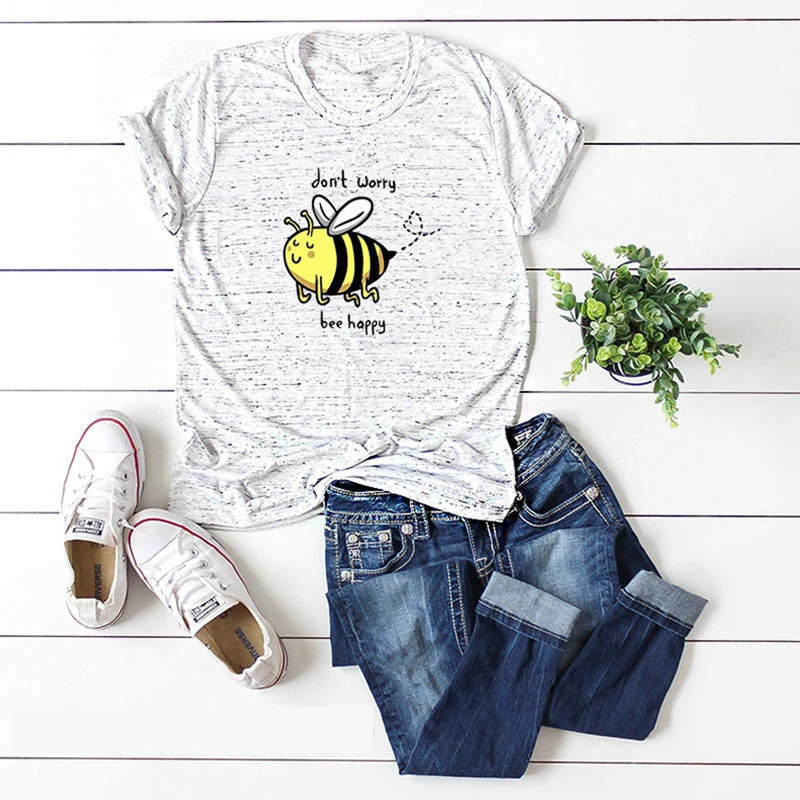 Женская футболка с надписью «Don't Worry Bee Happy», летняя свободная футболка с коротким рукавом, милая забавная Футболка с принтом пчелы, топы