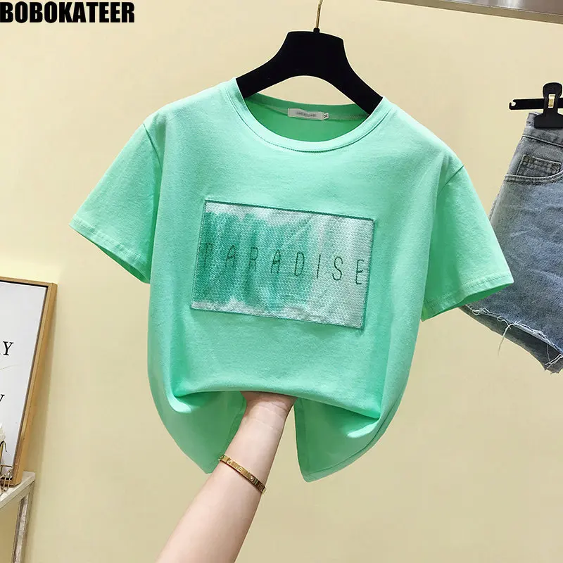Harajuku футболка женская летний женская одежда корейский стиль белая футболки женские с коротким рукавом желтый топы женские футболки Блестки футболка для женщин Мода Новый стиль 2020