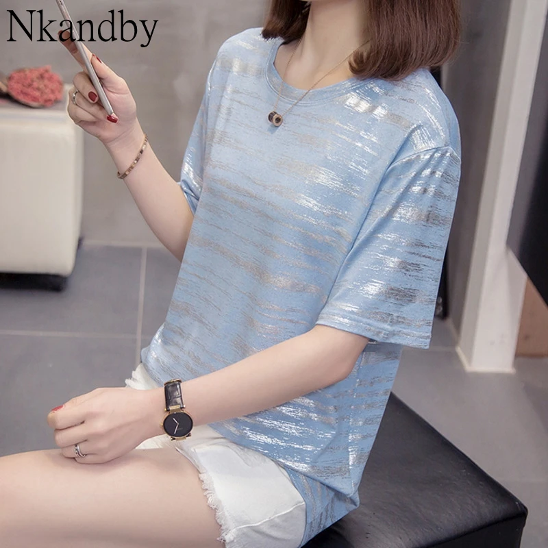Большие размеры, серебряные полосатые топы, футболки 2020, летние женские стильные свободные футболки с коротким рукавом, большие размеры