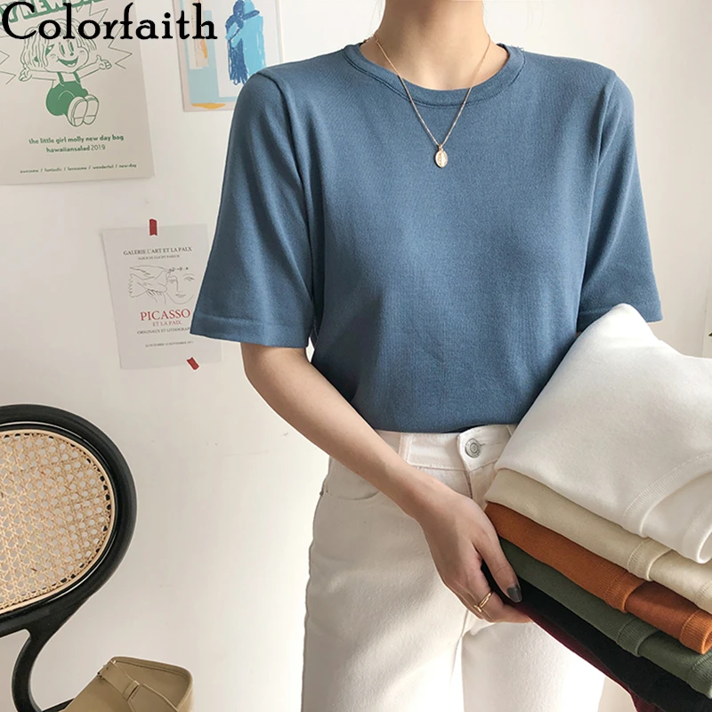Женские летние футболки Colorfaith, однотонные повседневные Мягкие вязаные топы в корейском минималистическом стиле, T6216, 2020