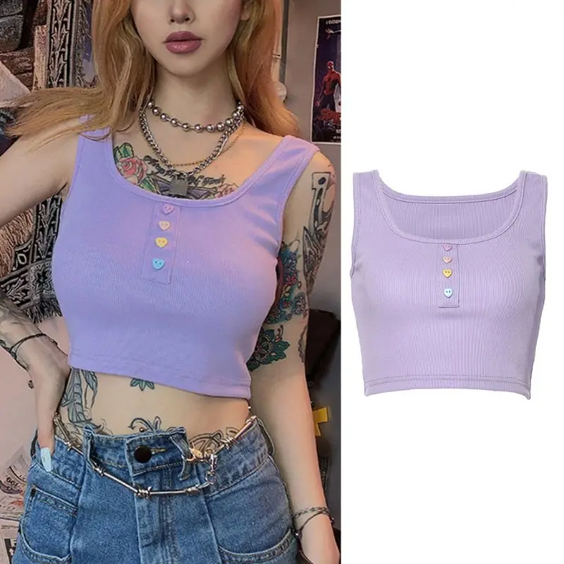 Женский сексуальный короткий топ с u-образным вырезом, яркие цвета, пуговицы в виде сердца, Трикотажный жилет в рубчик, фиолетовый, с открытыми плечами, Harajuku, тонкая рубашка, клубная одежда