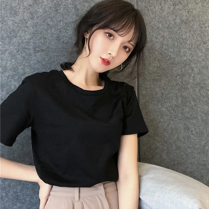 Летняя трикотажная футболка с короткими рукавами, шикарная однотонная тонкая футболка с v-образным вырезом и круглым вырезом, Корейская версия, женская футболка harajuku