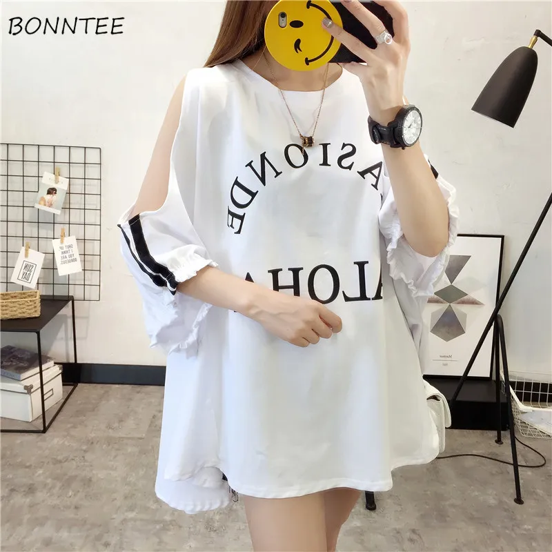 Футболки Для женщин короткие с рукавами «летучая мышь» футболка Женская Элегантный шик Для женщин s свободные студентов Мода с открытыми плечами Письмо печати Мягкие футболки