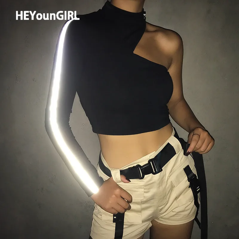 HEYounGIRL Холтер Черный на одно плечо топ светоотражающие полосы футболка с длинным рукавом для женщин Harajuku Готический повседневная женская футболка осень