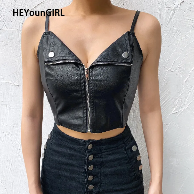 HEYounGIRL готический Харадзюку женский укороченный топ из искусственной кожи с открытой спиной сексуальный топ на бретельках футболки без рукавов из искусственной кожи черный топ 2020