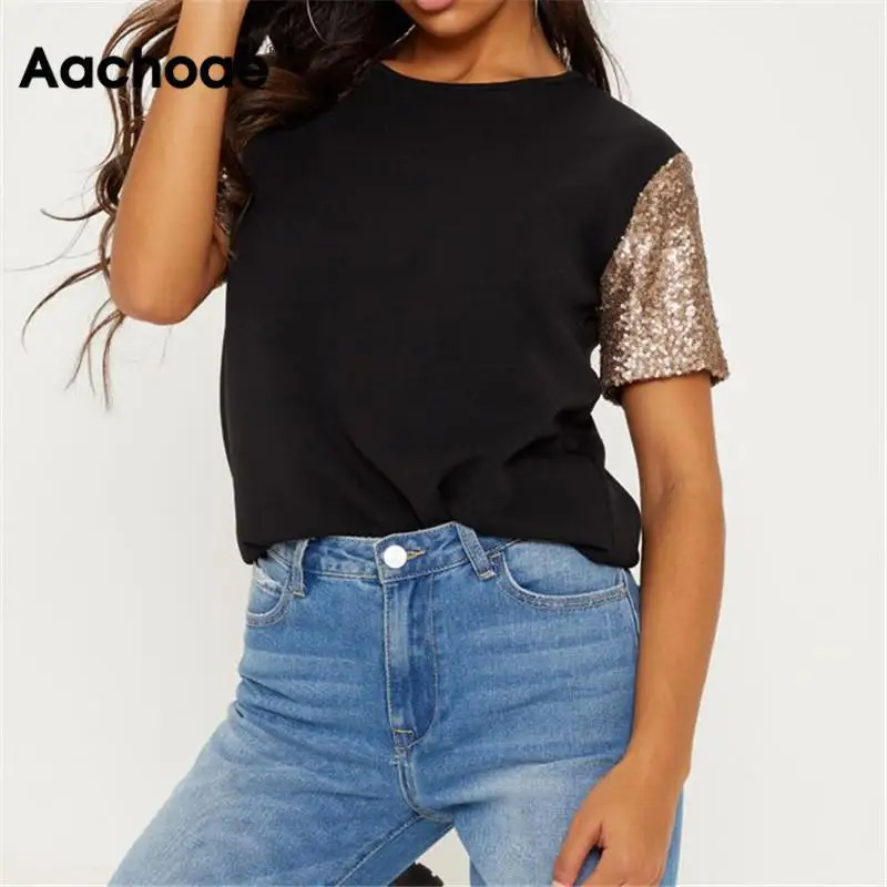 Летняя женская футболка 2019, новая модная Лоскутная футболка с коротким рукавом с блестками, Повседневная свободная туника с круглым вырезо...