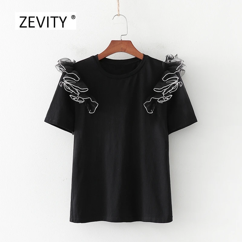 2020 новые женские модные каскадные оборки Сетчатое украшение из пряжи повседневные Черные футболки женские футболки с круглым вырезом шикарные топы для отдыха T658