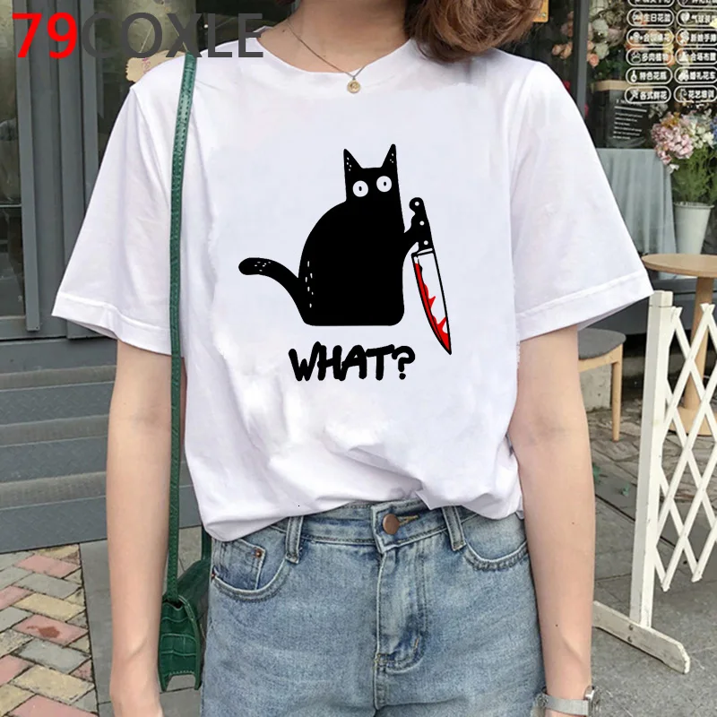 Футболка с котом и ножом для женщин, Kawaii Funnycartoon, футболка с котом, кавайная футболка с рисунком, большие размеры, унисекс, для женщин