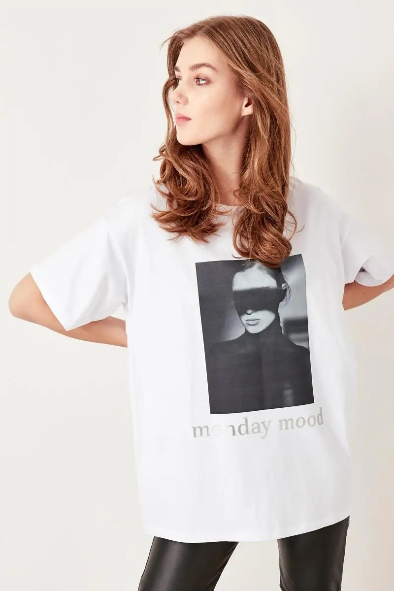 Trendyol белый Фольга и настольно-печатная бойфренд пресс-форма трикотажная футболка TWOSS19YN0055