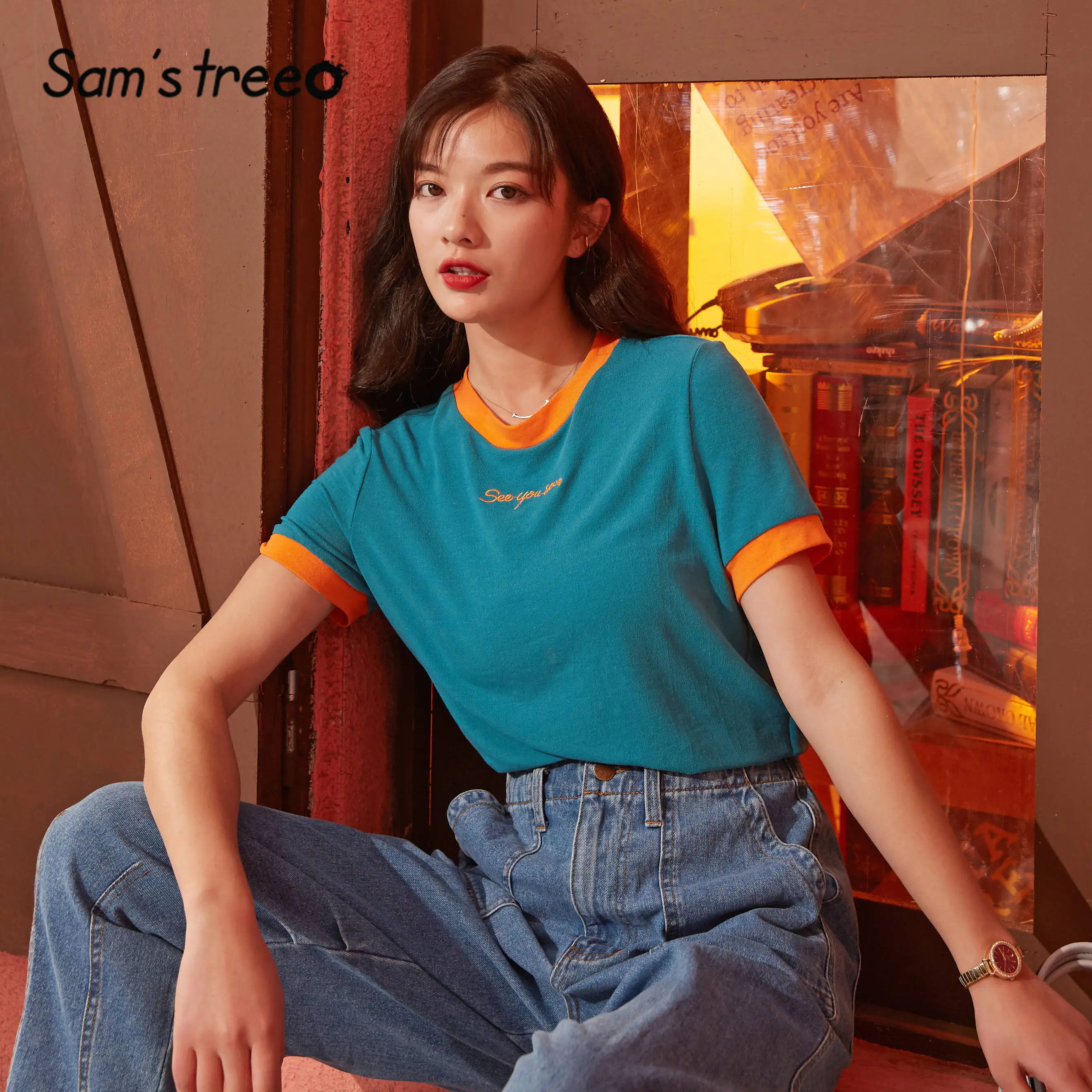 Женские повседневные футболки SAM'S TREE, черные однотонные футболки с вышитыми буквами, весна 2020, новые повседневные топы с короткими рукавами в Корейском стиле