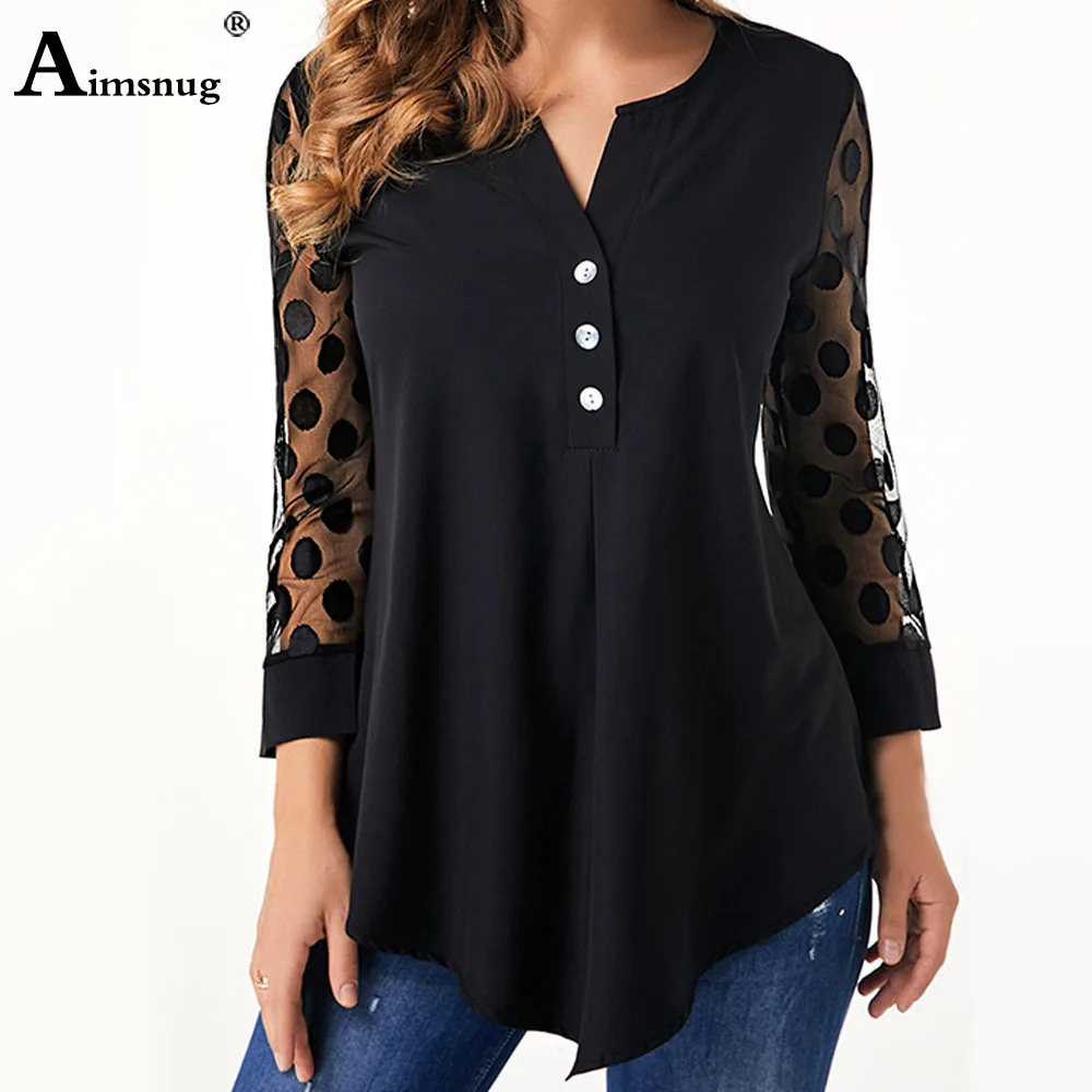 Aimsnug размера плюс 4xl 5xl Однотонный черный топ с v-образным вырезом на пуговицах с сеткой с рукавом девять очков Осенняя Новинка Повседневная Свободная Женская футболка