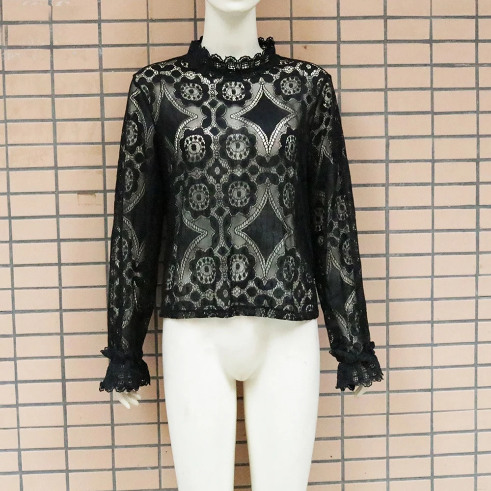 Aowofs/Женская Кружевная футболка с высоким воротником, топ с длинными рукавами, повседневные футболки, пикантные тонкие осенние футболки для ...