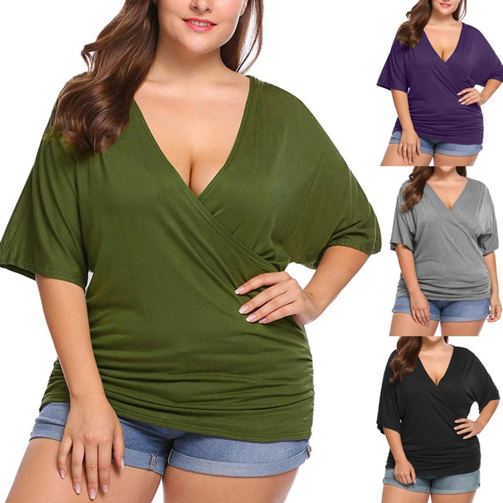 Женская футболка большого размера, Однотонная футболка с коротким рукавом и глубоким v-образным вырезом, повседневная женская футболка большого размера D30