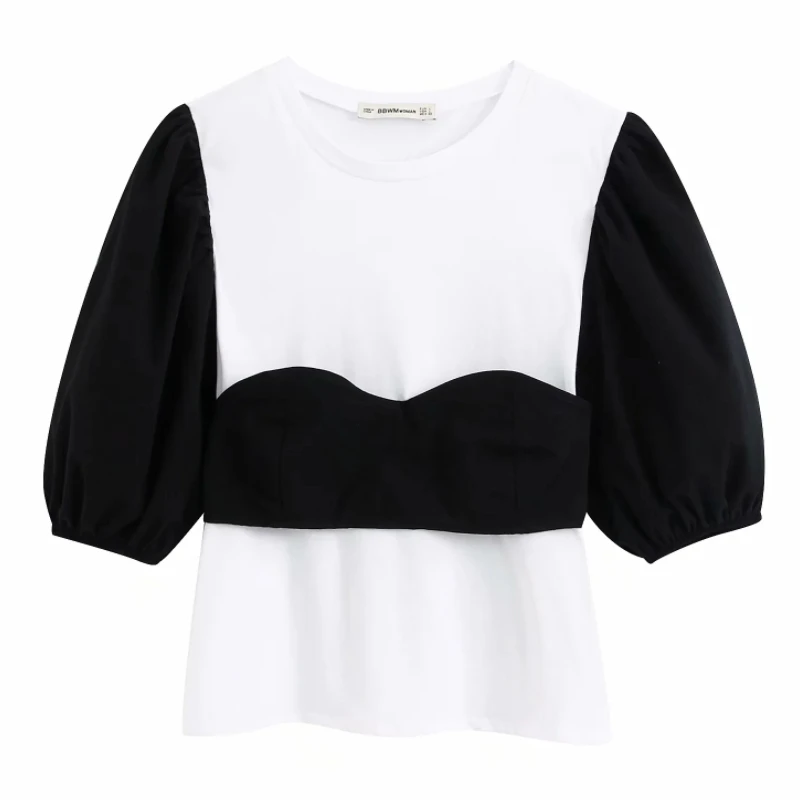 Новая Женская Базовая Повседневная футболка с круглым вырезом черного и белого цвета в стиле пэчворк, женская вязаная шикарная футболка с коротким рукавом, топы в стиле ретро, T604