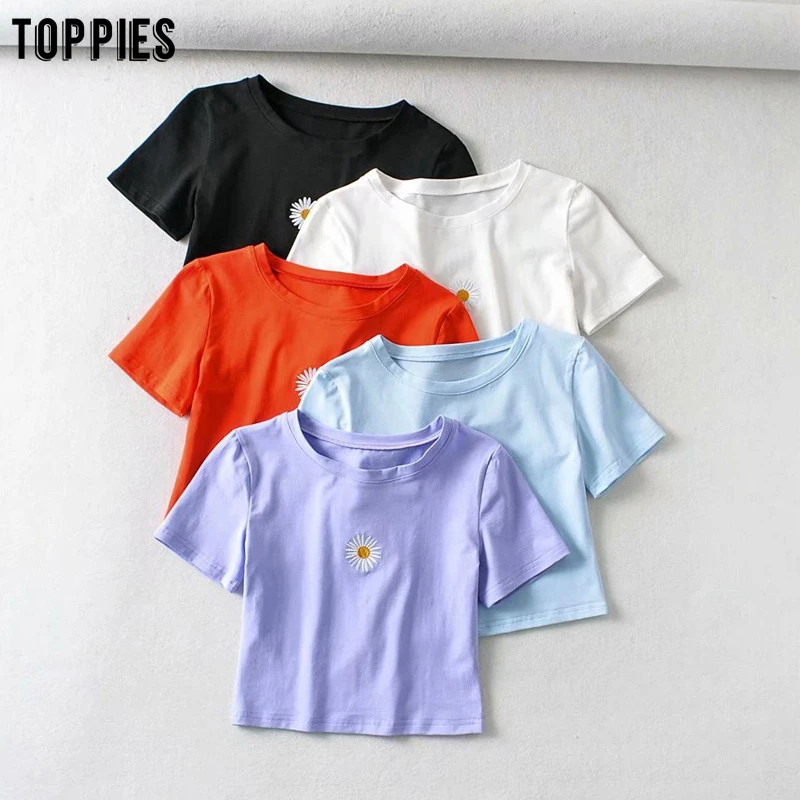 Топы; Летние укороченные топы; Футболки с вышитыми ромашками; Милые топы для девочек; Однотонные футболки с круглым вырезом