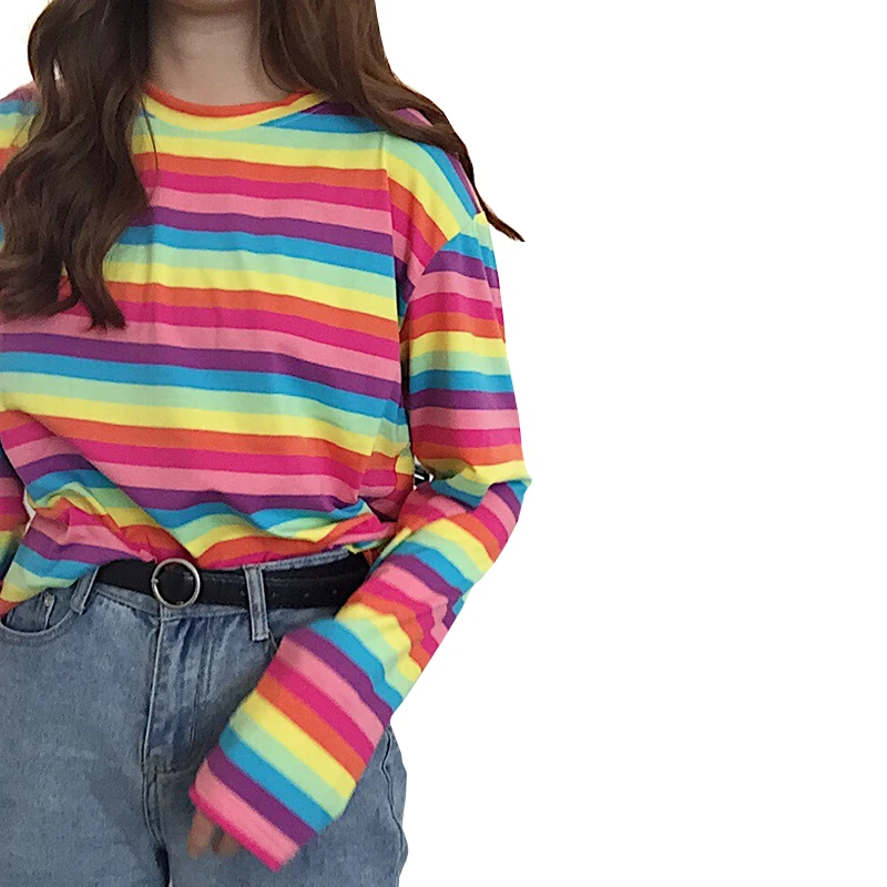Harajuku Kawaii Женская Повседневная Радужная полосатая футболка для девочек 2019 осень женская рубашка с длинным рукавом Женские футболки женские ...