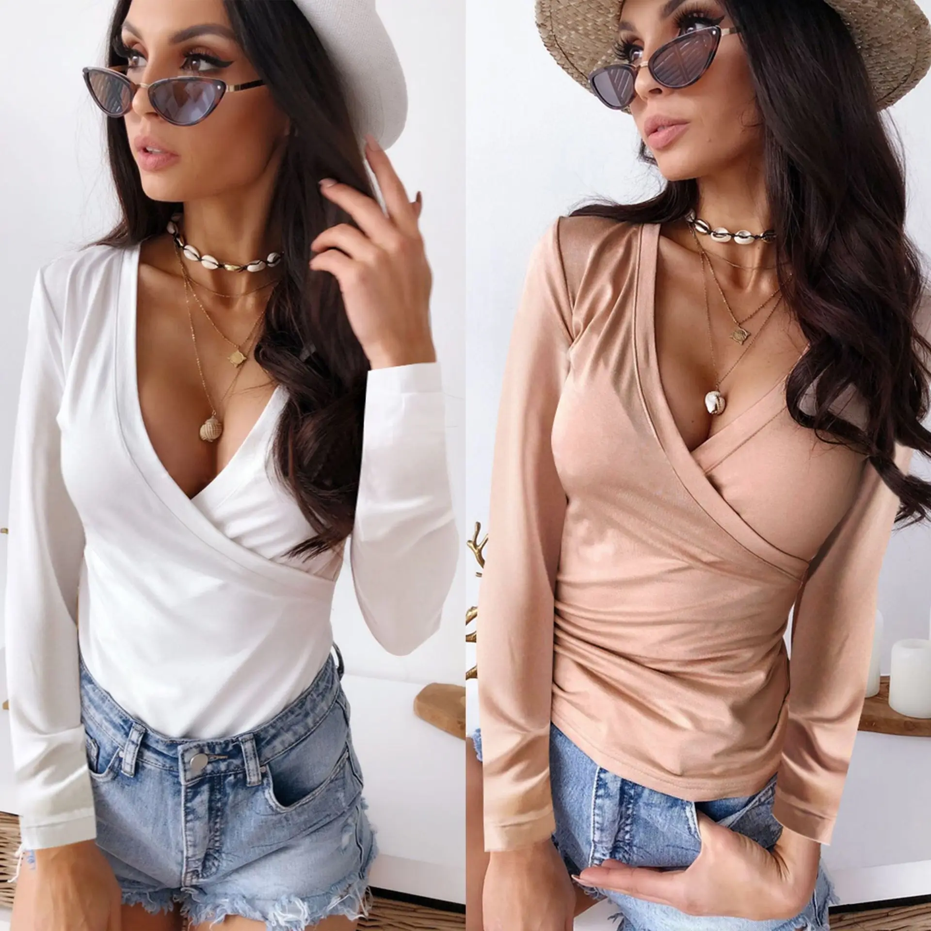 Женские топы и рубашки пикантный низкий разрез сплошной цвет белый бежевый длинный рукав женская футболка сексуальные топы Корейская одеж...