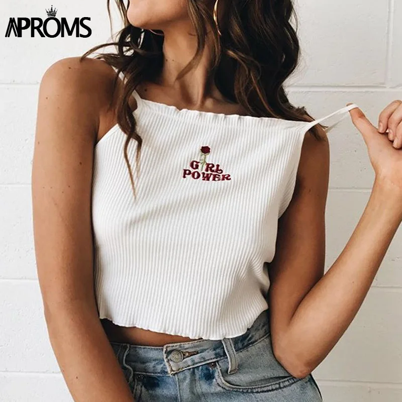 Aproms цветок Вышивка Майки Для женщин Мода 2019 без рукавов Белый Основные топы Прохладный Девушки Лето Уличная футболка Crop Top