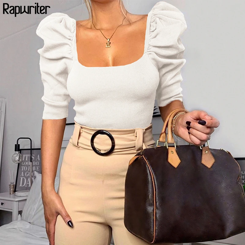 Rapwriter винтажная белая укороченная футболка с квадратным воротником и коротким рукавом для женщин 2020, однотонные футболки, весенние модные ч...