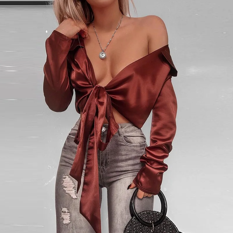 Женские атласные футболки с бантом v-образным вырезом элегантные атласные Футболки с длинным рукавом укороченные топы 2019 Модные женские То...