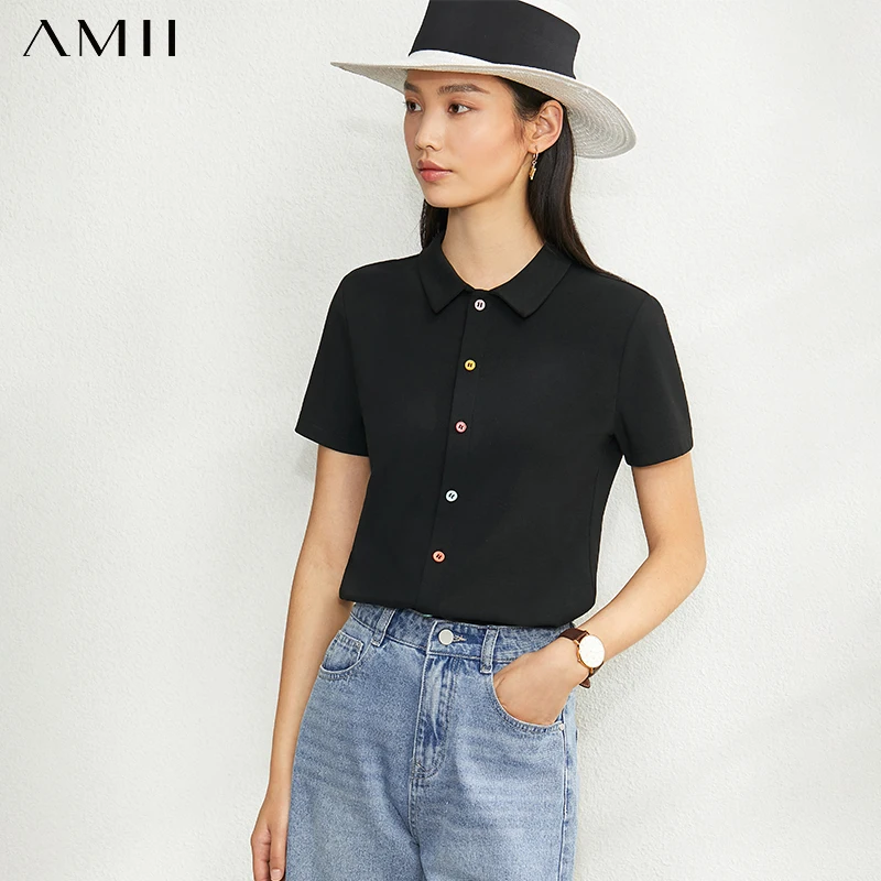 AMII минимализм весна лето однотонный классический Поло рубашка Женская Повседневная приталенная однобортная женская рубашка Топы 12070142