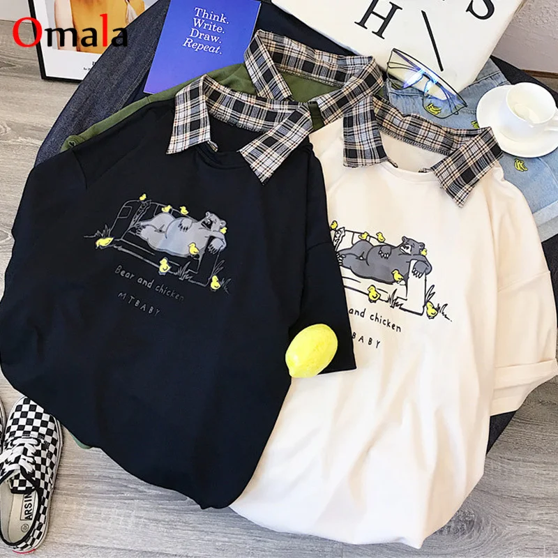 Летняя новинка Женская футболка с коротким рукавом с мультяшным принтом harajuku хлопковые повседневные свободные футболки клетчатые лоскутные футболки консервативного стиля Топы