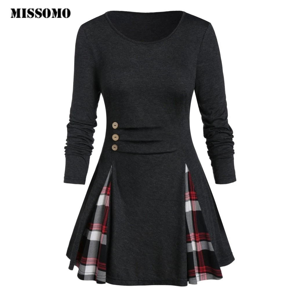 MISSOMO футболка с длинным рукавом Женские топы туника-безрукавка на пуговицах клетчатый принт Винтажная футболка для полных camiseta mujer 9