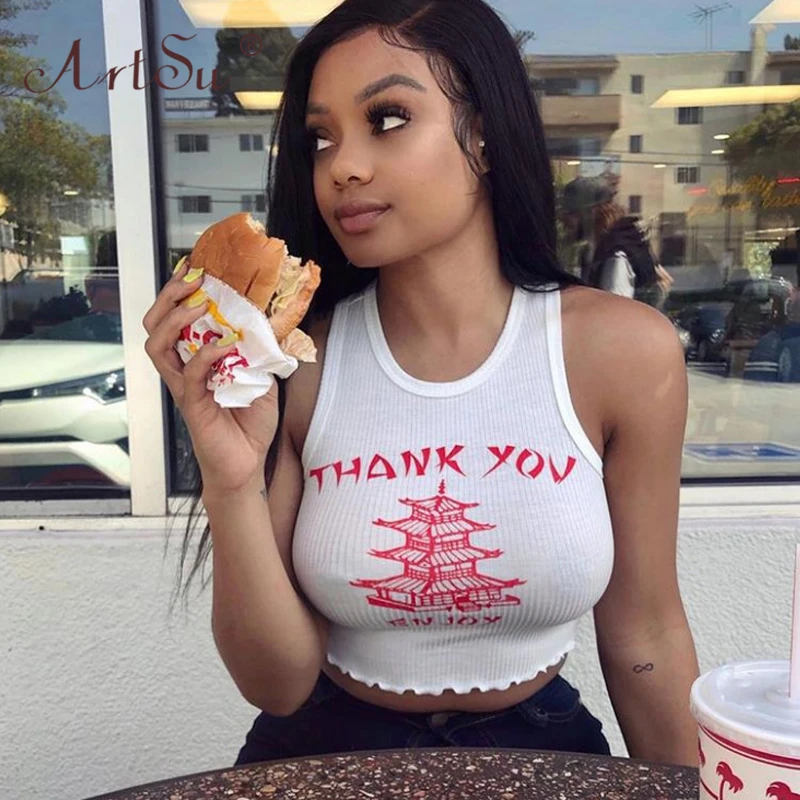 Женский трикотажный топ ArtSu, белый, черный топ с круглым вырезом и принтом, повседневный обтягивающий укороченный топ на лето 2020