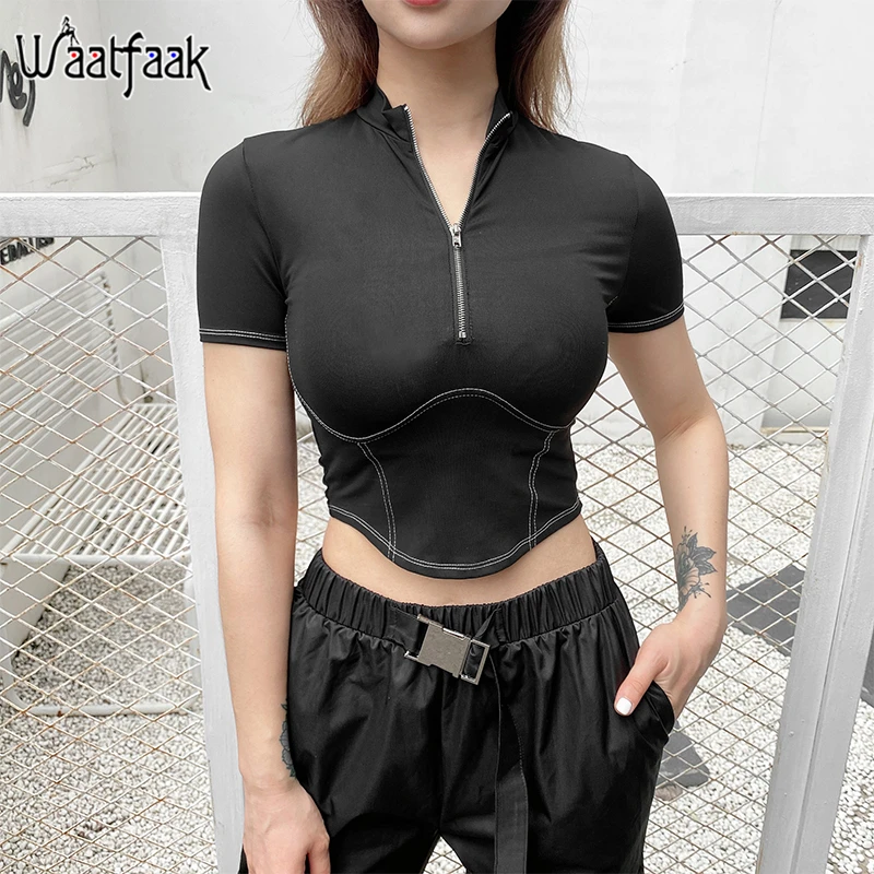 Waatfaak Curve тонкая черная футболка укороченный топ в полоску с вышивкой Повседневная футболка с коротким рукавом женская футболка на молнии с круглым вырезом Harajuku