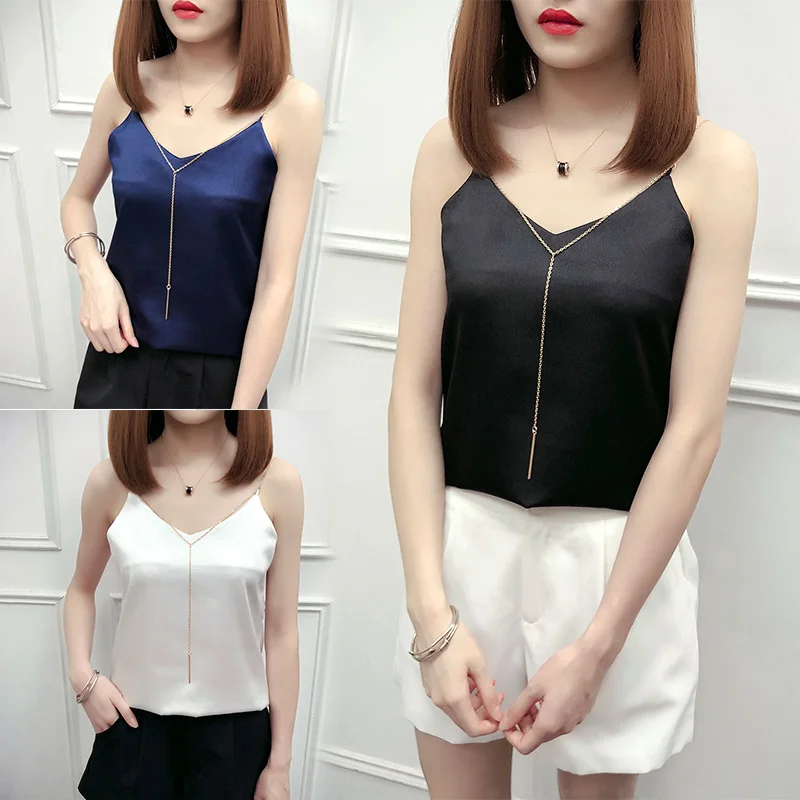 Летняя однотонная Сексуальная атласная цепочка с v-образным вырезом и тонким ремешком; женские майки-ками; Цвет черный, розовый, белый; вечер...